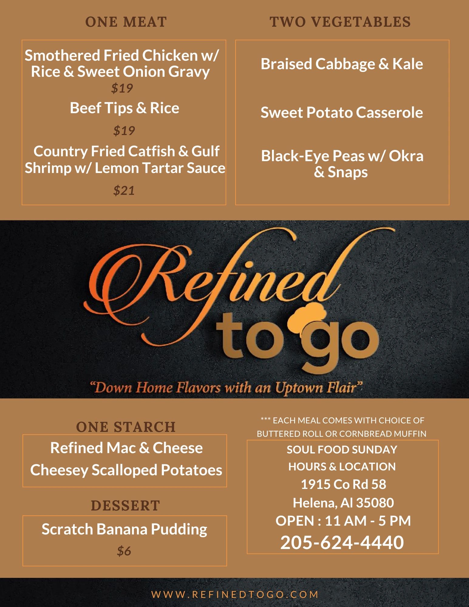 We are more than just a meat and three........just NOT on Sundays. Sundays at Refined are Soul Food Sundays. Each Sunday our menu will offer a variety of Soul Food selections. The first Sunday of every month we will always feature Chef J's famous oxtails simmered all morning. Come on by on Sunday between 11-5 to get a Refined Soul Food experience like no other.. Check back each week to view our new Soul Food Sunday menu.