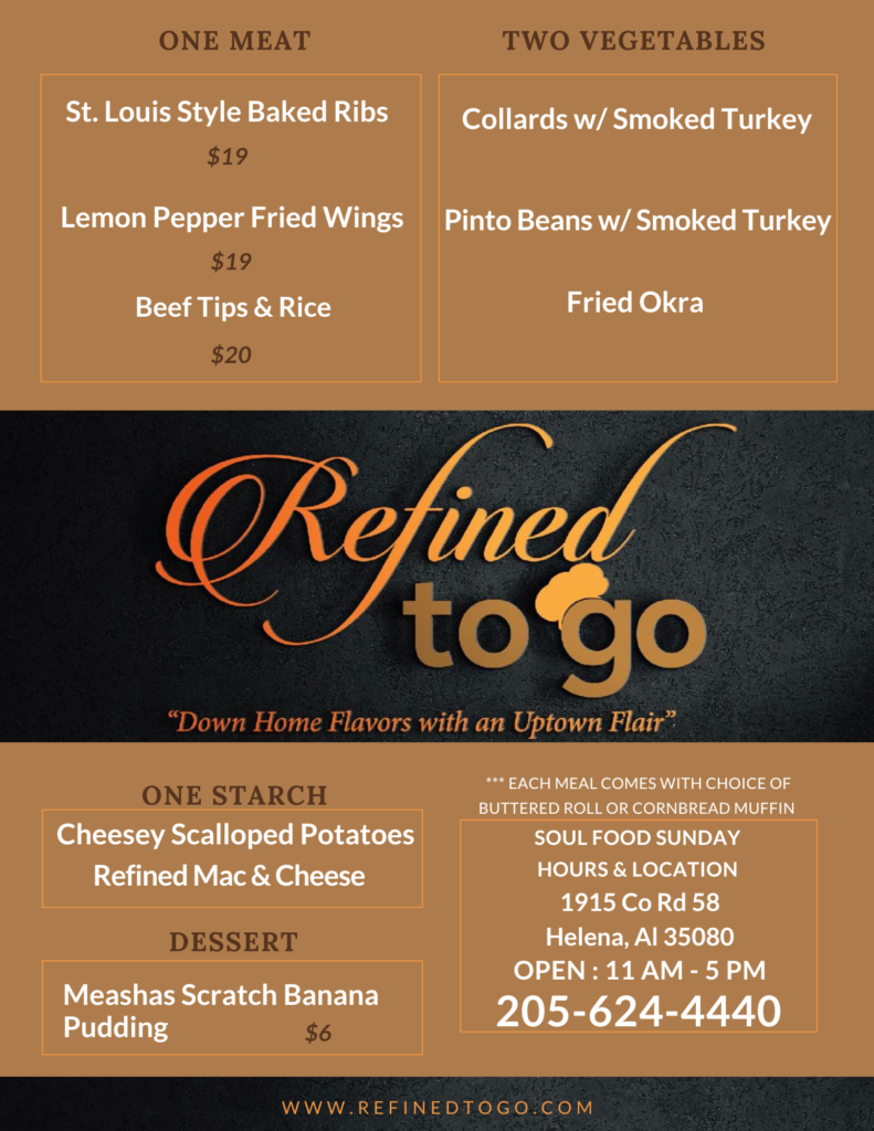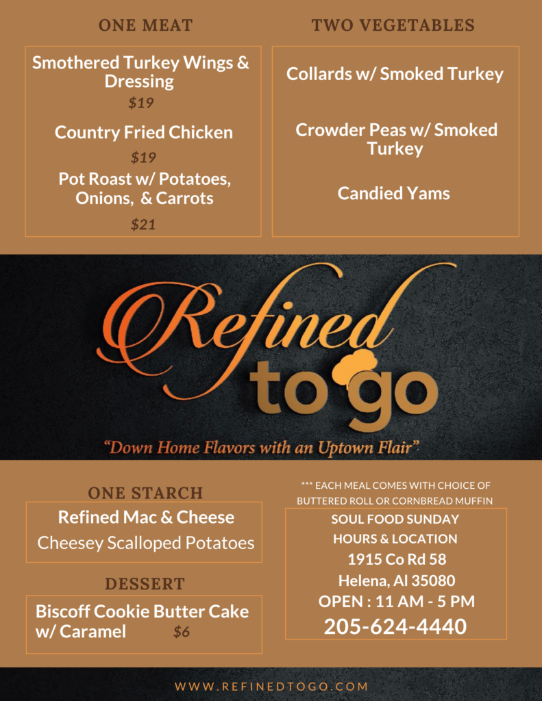 We are more than just a meat and three……..just NOT on Sundays. Sundays at Refined are Soul Food Sundays. Each Sunday our menu will offer a variety of Soul Food selections. The first Sunday of every month we will always feature Chef J’s famous oxtails simmered all morning. Come on by on Sunday between 11-5 to get a Refined Soul Food experience like no other.. Check back each week to view our new Soul Food Sunday menu.